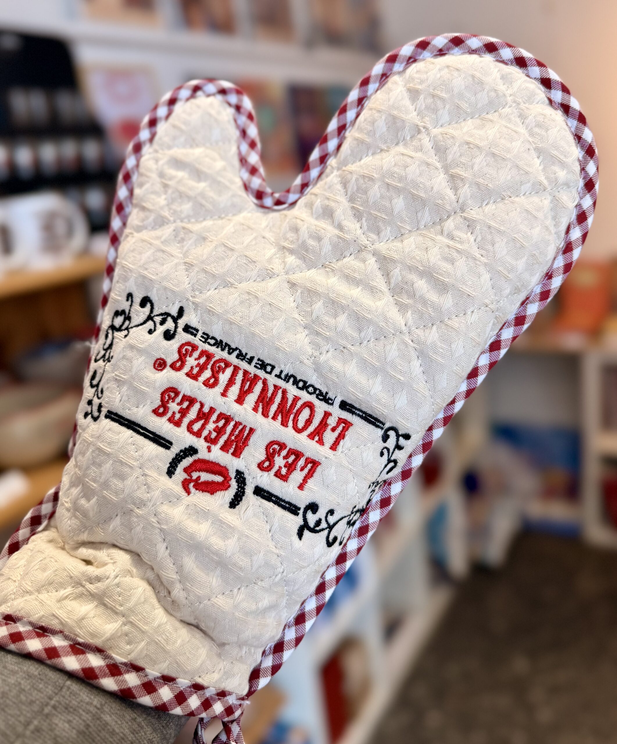 Protégez vos mains avec style grâce à ces gants de cuisine “Mère Lyonnaise”, à la fois pratiques et pleins de caractère ! Inspirés des célèbres cuisinières lyonnaises, ils incarnent l’esprit chaleureux, généreux et authentique de la gastronomie de Lyon.