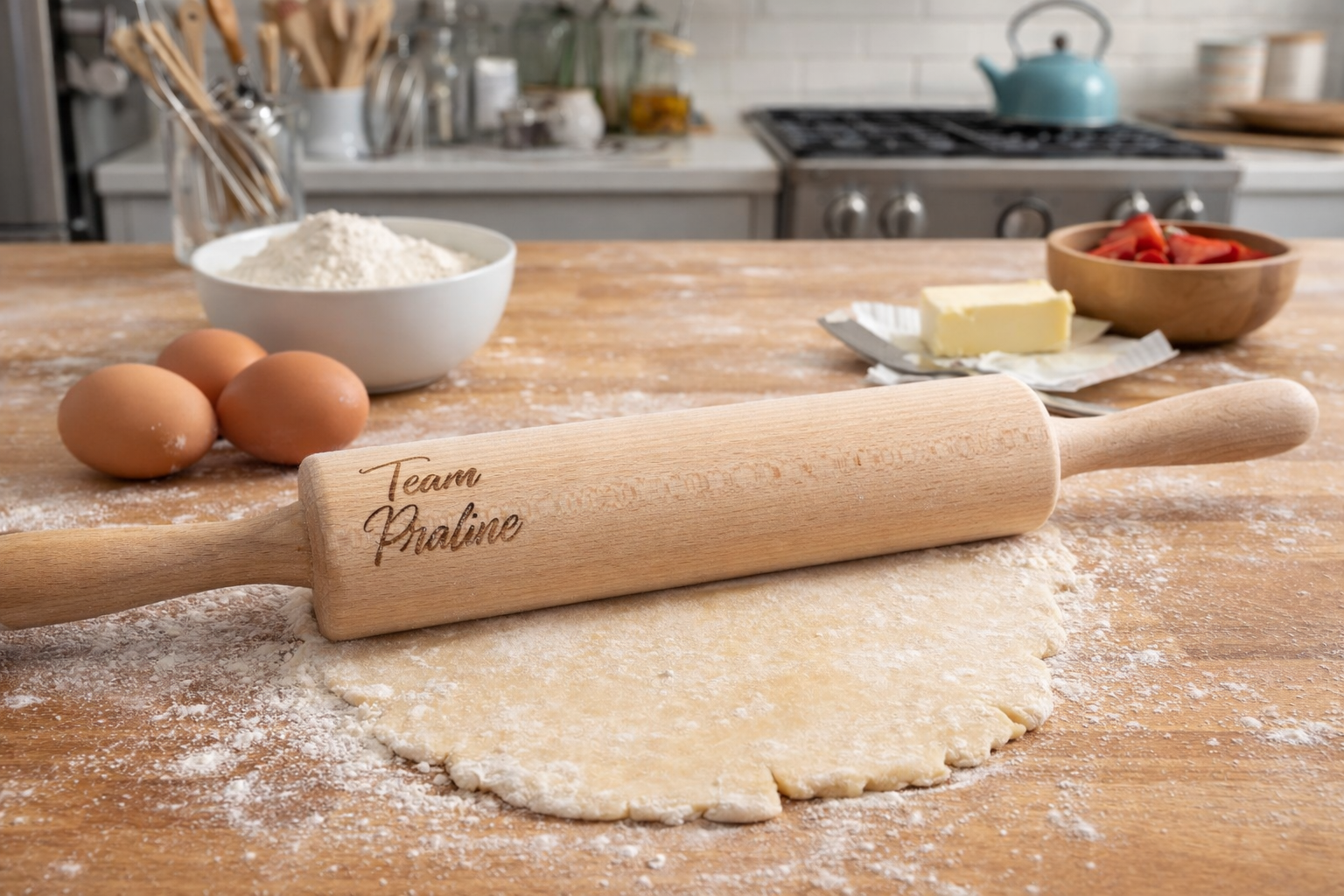 Le rouleau à pâtisserie des vrais gourmands lyonnais en bois naturel, gravé Team Praline de Lyon